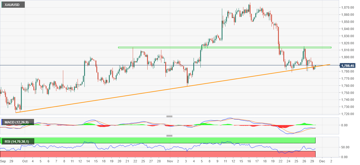 The pullback in the US Treasury yields and firmer equities favor gold buyers to bounce off an immediate key support line. However, looming concerns over the South African variant of the coronavirus, dubbed as Omicron, joins anxiety ahead of the week’s key events to restrict the commodity’s moves.