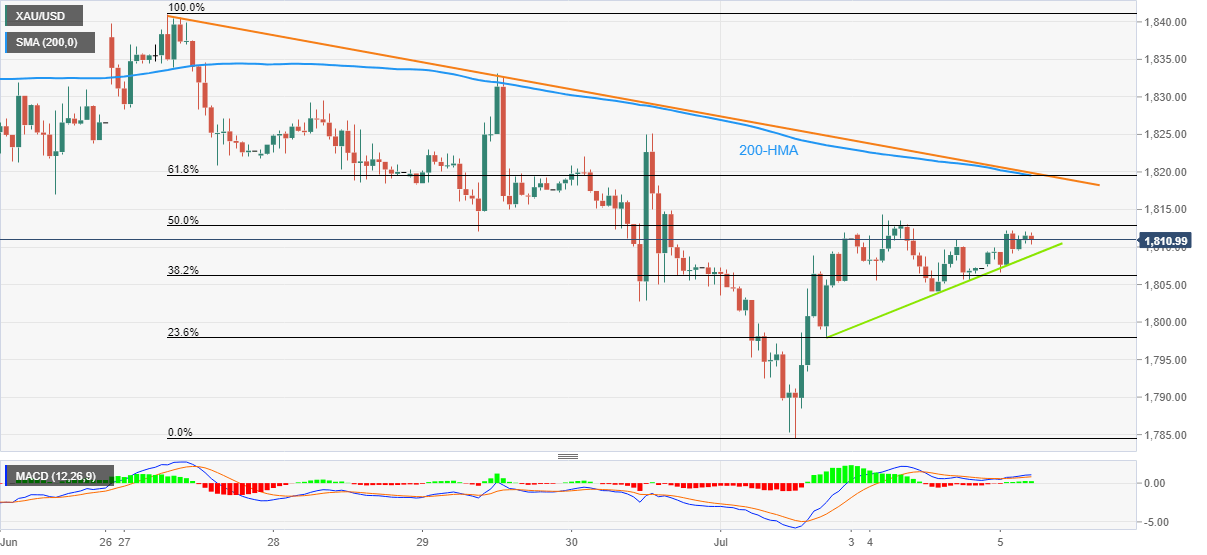 Gold Price grinds higher as the bullish MACD signals and sustained trading beyond the two-day-old support line keep buyers hopeful. However, repeated pullbacks from the 50% Fibonacci retracement of June 27 to July 01 downturn, around $1,813, tests the upside momentum.