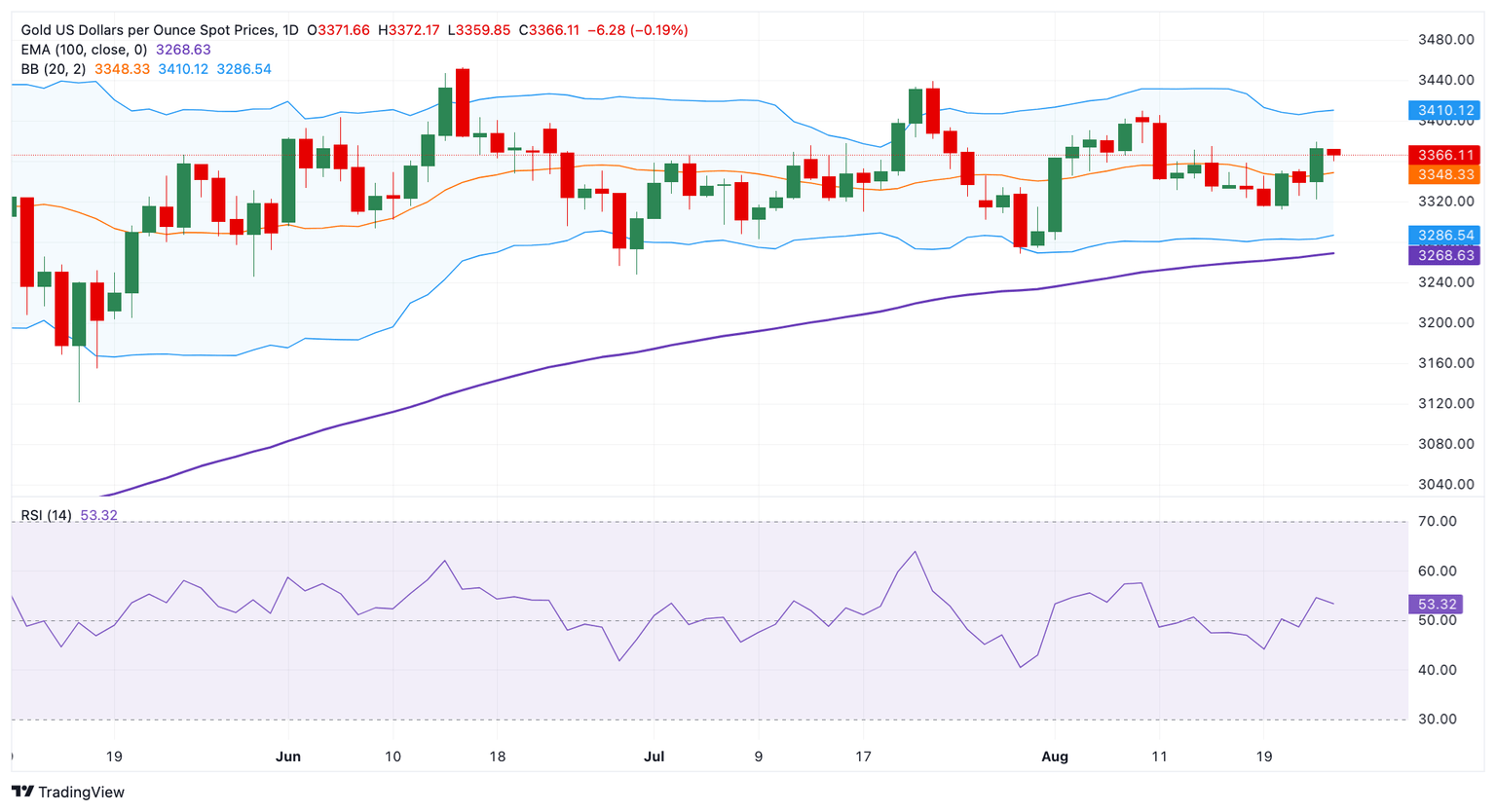 In the bearish event, the initial support level for the yellow metal is located at $3,315, the low of August 19. A break below the mentioned level might even drag the gold price lower to $3,285, the lower limit of the Bollinger Band. The next contention level to watch is $3,268, the 100-day EMA.
