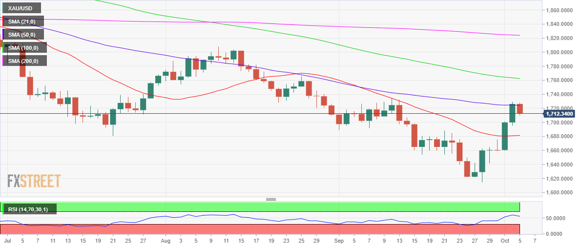 Technically, the bearish 50-Daily Moving Average (DMA) at $1,724 has tempered the gold price rally. A sustained break above the 50 DMA is needed to challenge the September highs at $1,735, above which the $1,750 psychological level will come into play.
