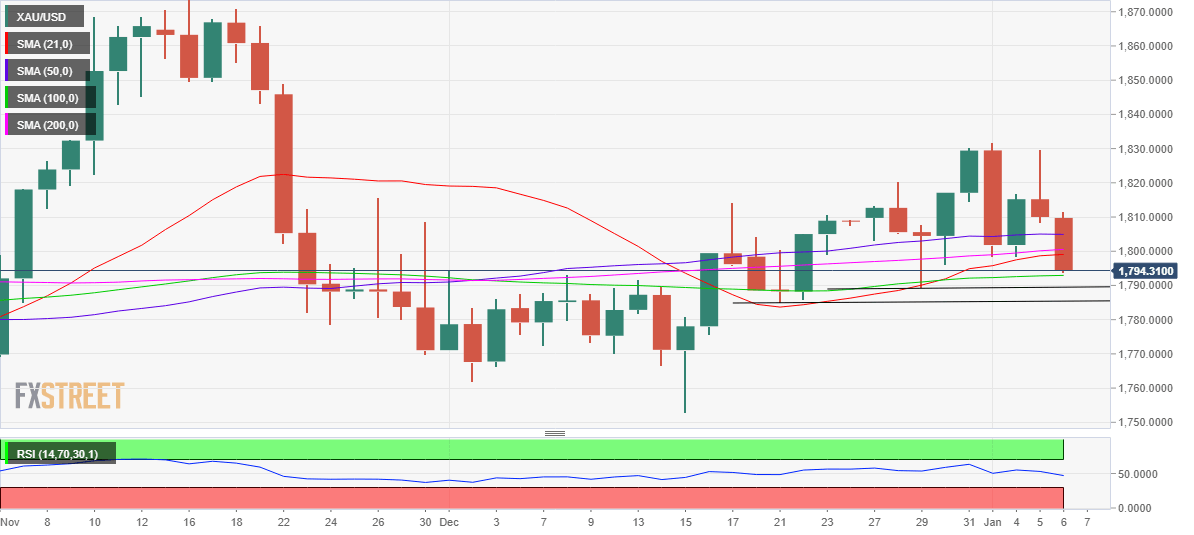 Gold’s daily chart shows that the latest leg down has taken out all the major Daily Moving Averages (DMA) support levels, as bears now attack the 100-DMA at $1,793.