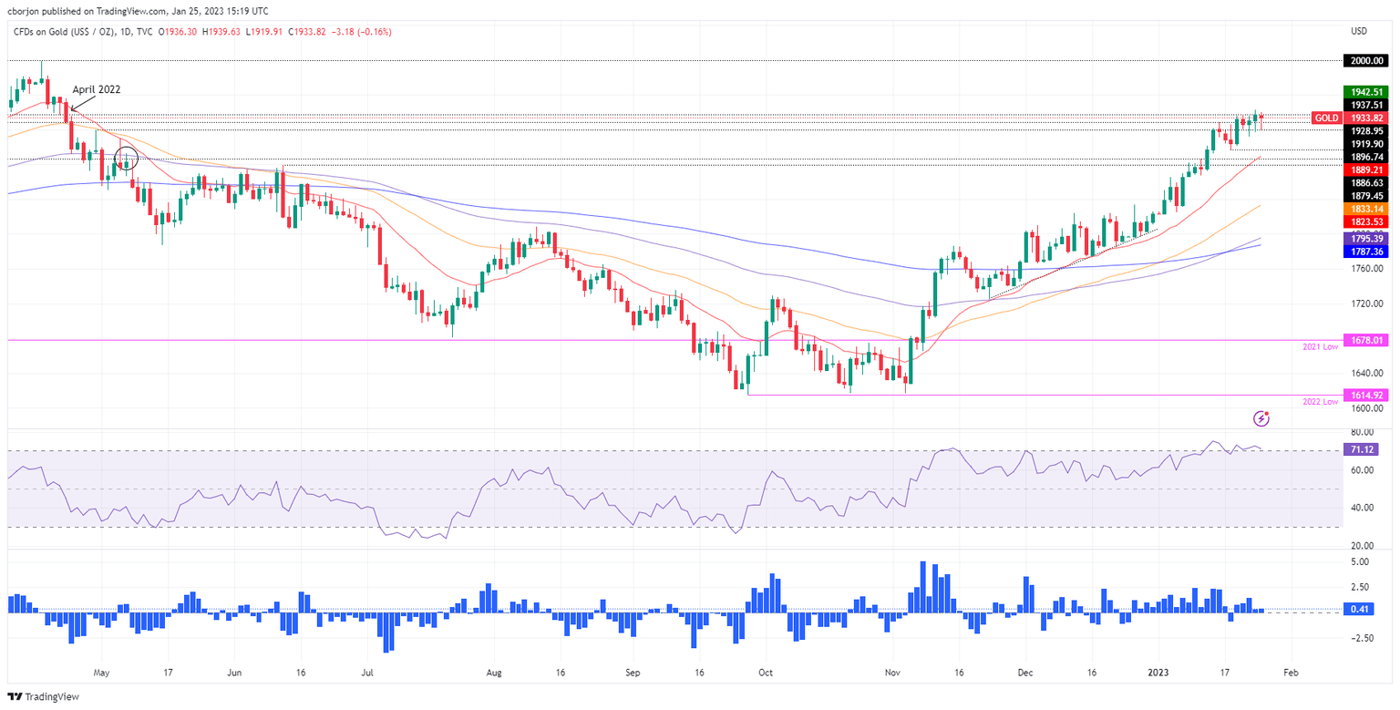 XAU/USD key support levels are $1,900, followed by the $1,896.74 January 18 daily low. Break below will expose the 20-day Exponential Moving Average (EMA) at $1,889.22. On the other hand, for an uptrend continuation, XAU/USD needs to reclaim $1,950 as it aims to rally toward $2,000.
