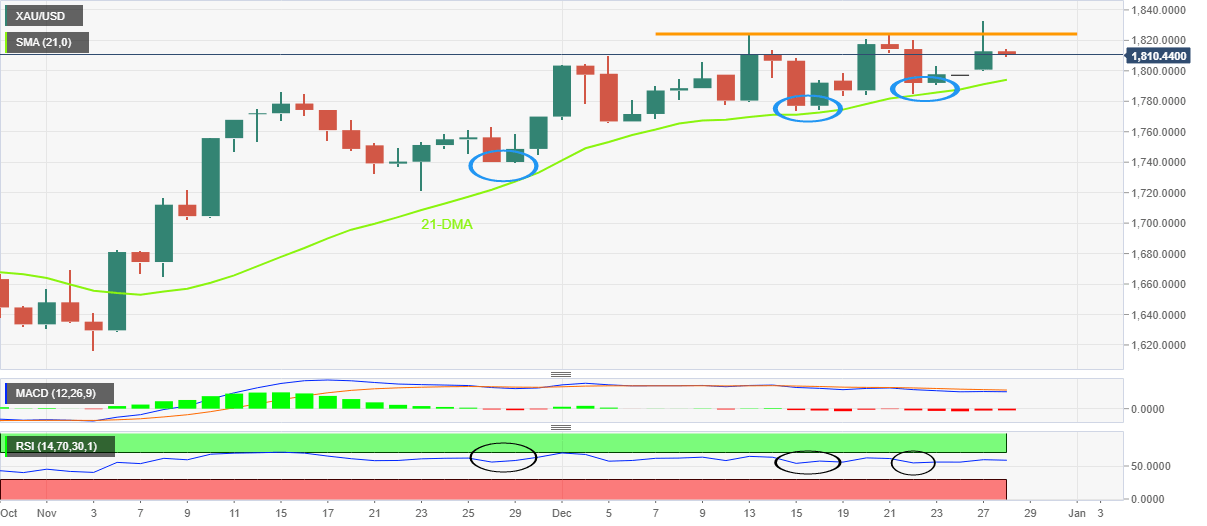 Gold price (XAU/USD) retreats to $1,810 as it pares the latest gains around the six-month high, flashed the previous day, while snapping a two-day winning streak during early Wednesday morning in Europe. In doing so, the yellow metal justifies the US Dollar rebound, as well as receding optimism surrounding China amid the sluggish trading session amid the holiday season.