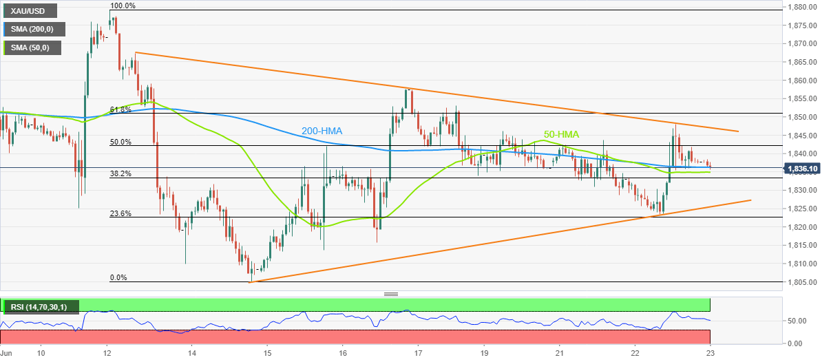 Given the RSI retreat from the overbought territory backing the metal’s latest weakness, the XAU/USD prices may decline below the immediate HMA confluence surrounding $1,835.