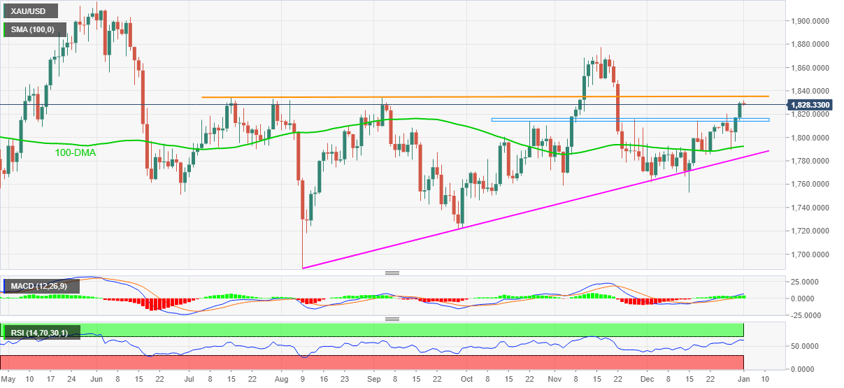 After a disappointment in 2021, gold (XAU/USD) kick-starts 2022 on a firmer foot around $1,830 during Monday’s Asian session. In doing so, the yellow metal cheers market’s risk-on mood amid a light calendar and off in multiple markets ahead of the key weekly events.