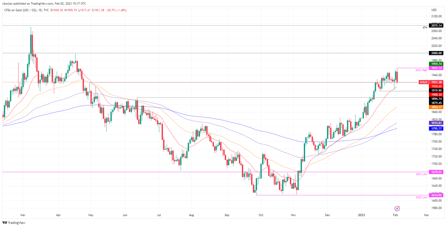 Gold price retreats after hitting a nine-month high at $1,959.74, however, it is below the $1,950 barrier at the time of writing after comments from Chairman of the US Federal Reserve Jerome Powell on Wednesday, led to an influx into risk assets (away from Gold) and data out of the United States (US) economic docket revealed the labor market remains resilient, thus further weighing on the safe-haven yellow metal. In addition, two other central banks, namely the Bank of England (BoE) and the European Central Bank (ECB), continued to tighten aggressively. At the time of writing, the XAU/USD exchanges hands at around $1,920, below its opening price.