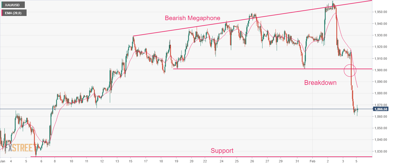 Gold price has demonstrated a nosedive move after delivering a breakdown of the Bearish Megaphone chart pattern that replicates a broadening triangle. The Gold price might find a cushion around the potential support from the January 5 low of around $1,825.08.