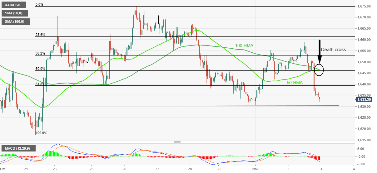 A swift pullback from a weekly top joins bearish MACD signals to highlight the impending death cross as the 100-HMA pokes the 50-HMA from above. With this, the gold price drops towards the weekly bottom of $1,630 before targeting the previous monthly low near $1,617.