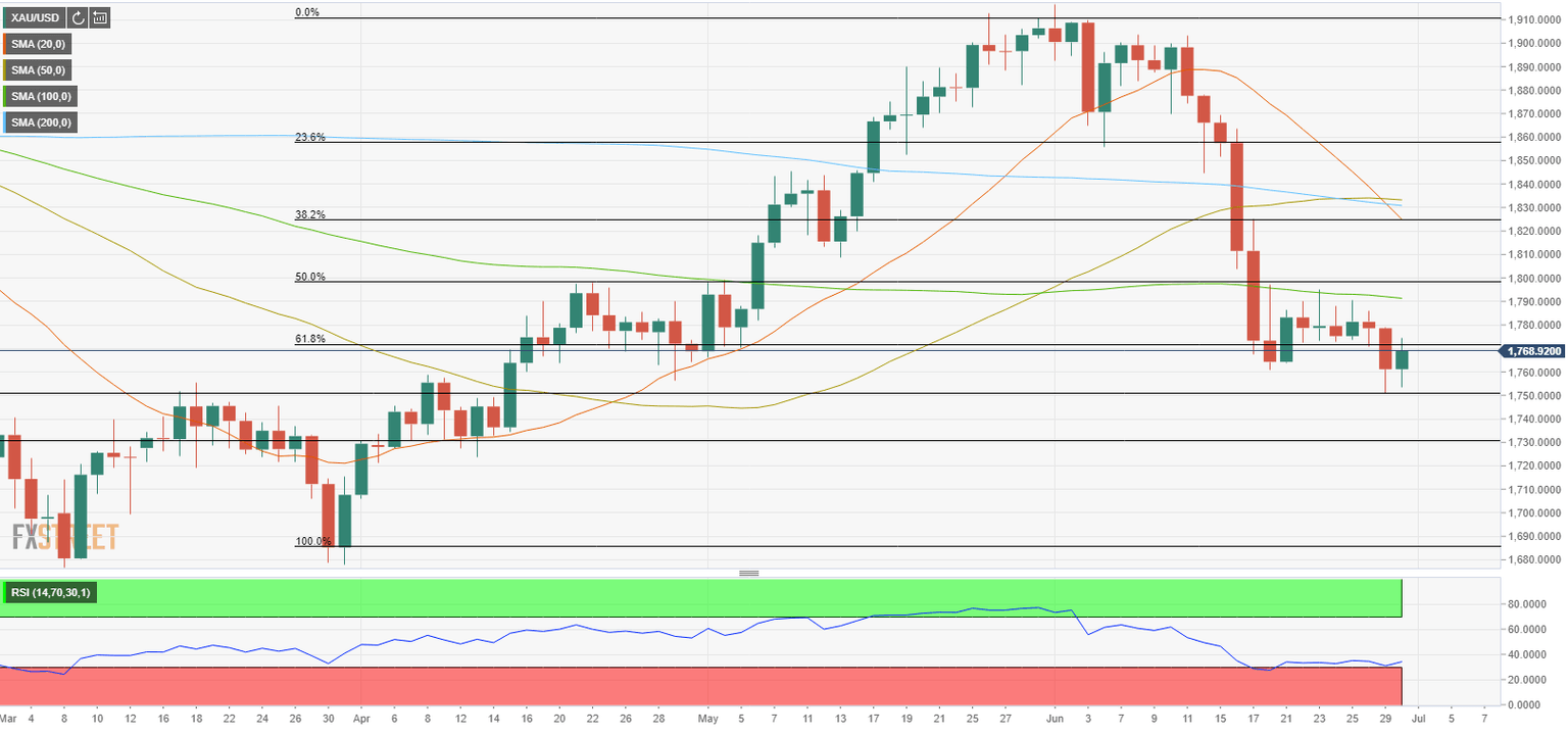After falling to its lowest level since mid-April at $1,750 on Tuesday, gold managed to stage a decisive recovery on Wednesday and was last seen gaining 0.65% on a daily basis at $1,772.