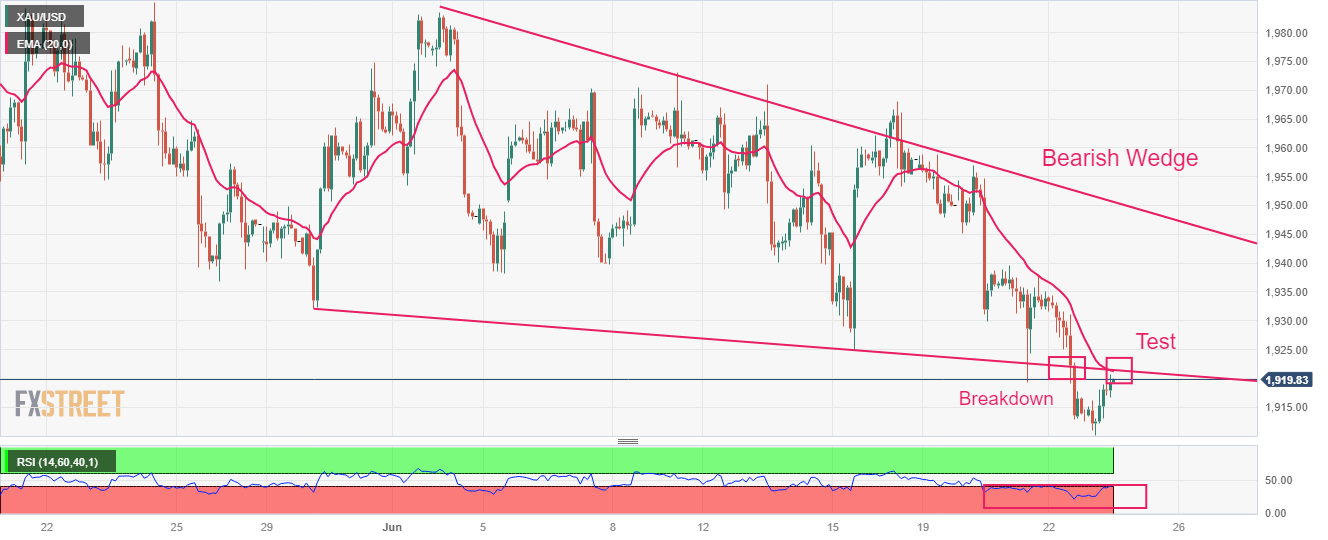 - Gold price has shown a minor recovery to test the breakdown region of the Bearish Wedge chart pattern around $1,921.11.
