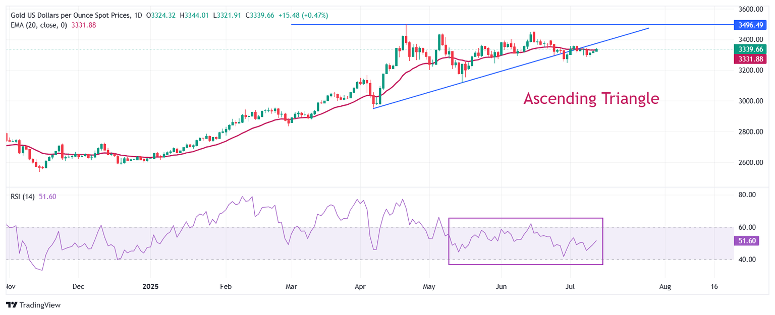 Gold price recovers to near the 20-day Exponential Moving Average (EMA), which trades around $3,330. The precious metal stays below the Ascending Triangle formation on a daily timeframe.