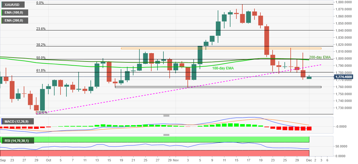 The yellow metal dropped the most in a week to conquer two-month-old support the previous day while poking the lowest levels since November 04 amid sour sentiment. While tracing the clues, the varied opinion of the current vaccines’ ability to tame the South African strain for the coronavirus, dubbed as Omicron, joined comments from Federal Reserve (Fed) Chairman Jerome Powell could be termed as the key catalysts.