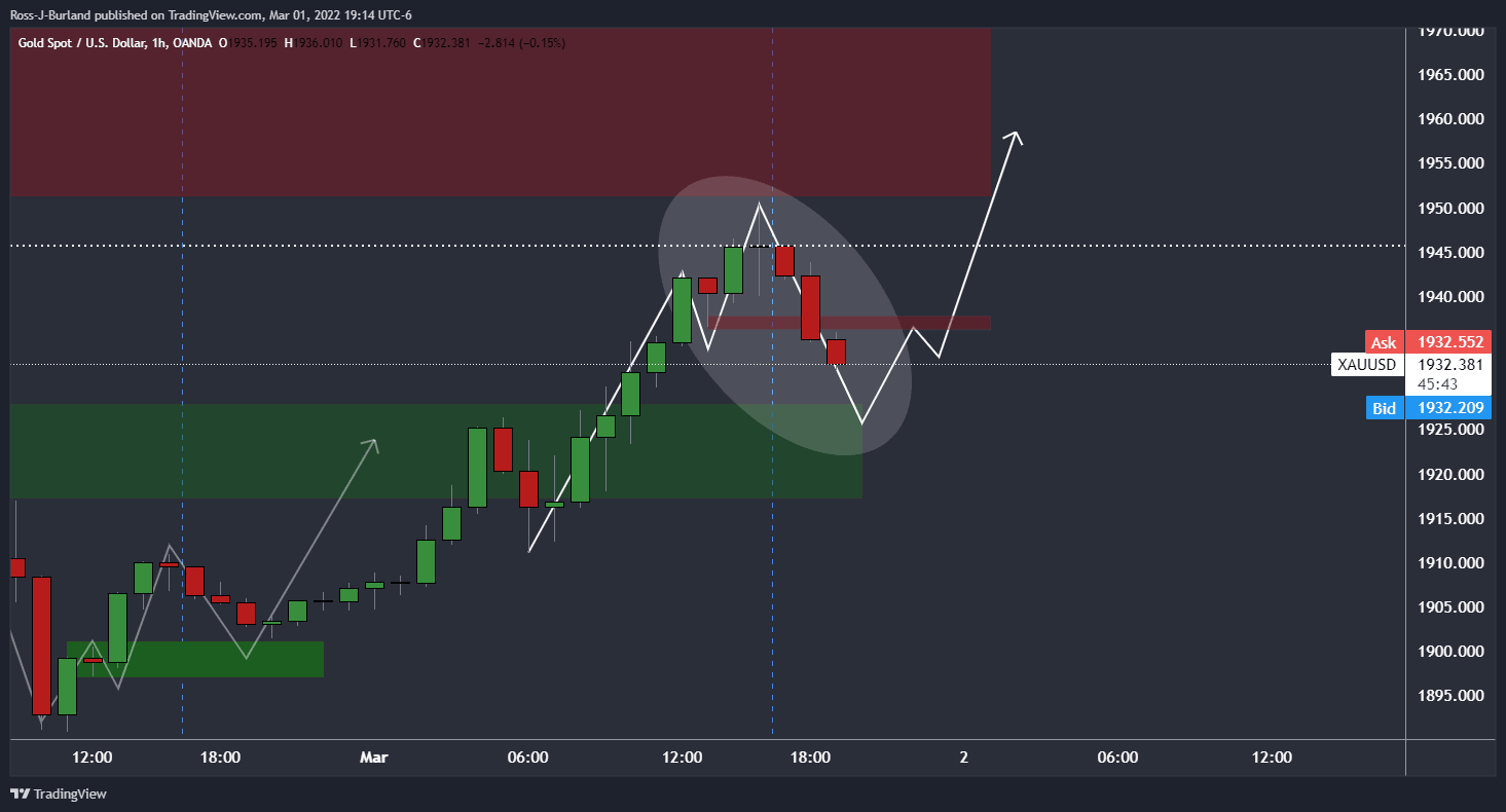 The price has followed the projected path and is starting to firm an M-formation. The neckline would be expected to act as resistance and while the price is below there, then the bias is bearish. However, so long as the support around the old resistance near $1,927 holds up, then there will be prospects for a move higher as illustrated above.