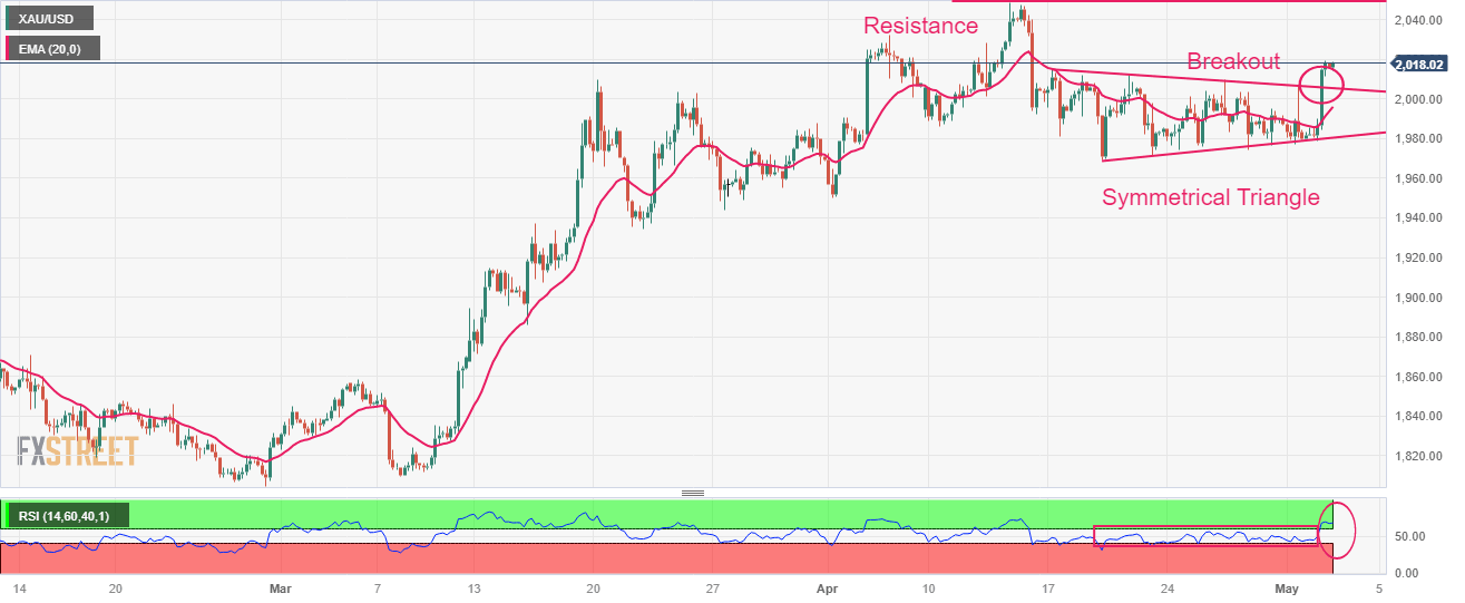 Gold price delivered a breakout of the Symmetrical Triangle chart pattern formed on a four-hour scale, which results in wider ticks and heavy volume. The yellow metal is marching towards the horizontal resistance plotted from April 13 high at $2,048.75.