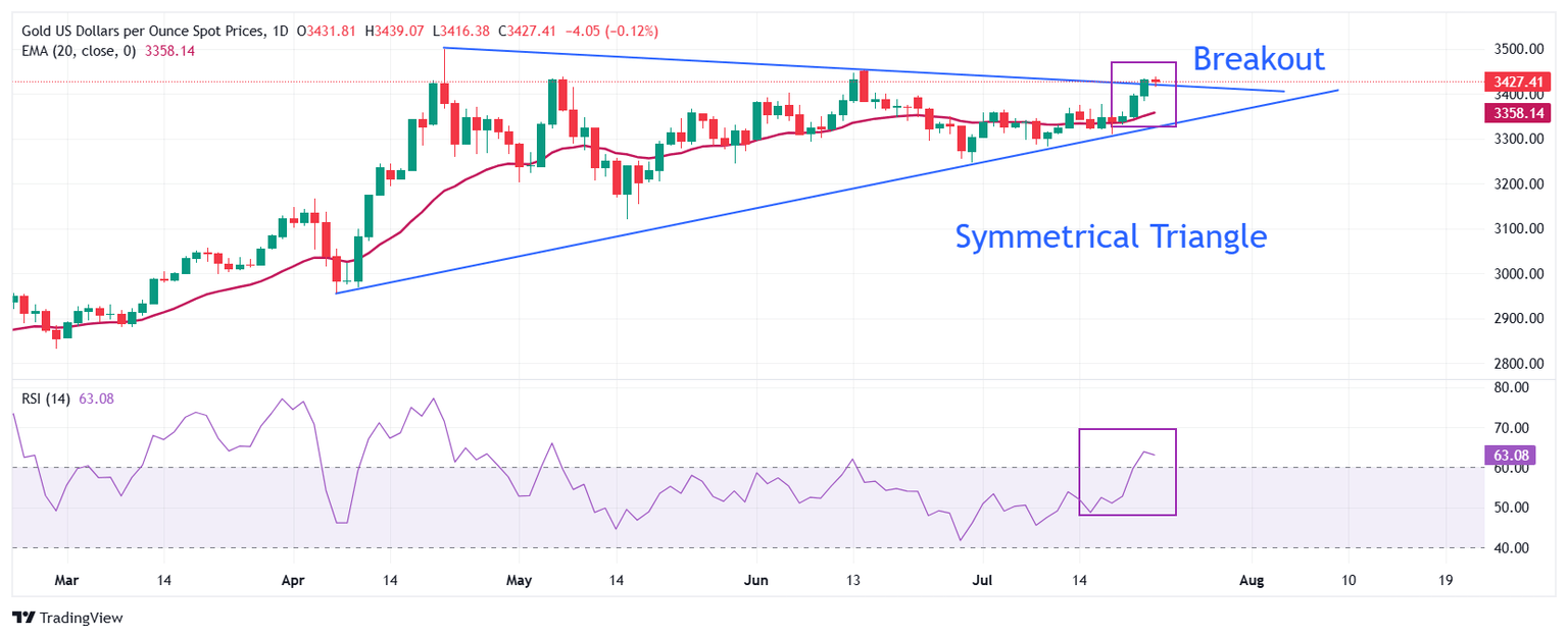 - Gold price holds onto gains above $3,400 as US-EU trade tensions continue to persist.