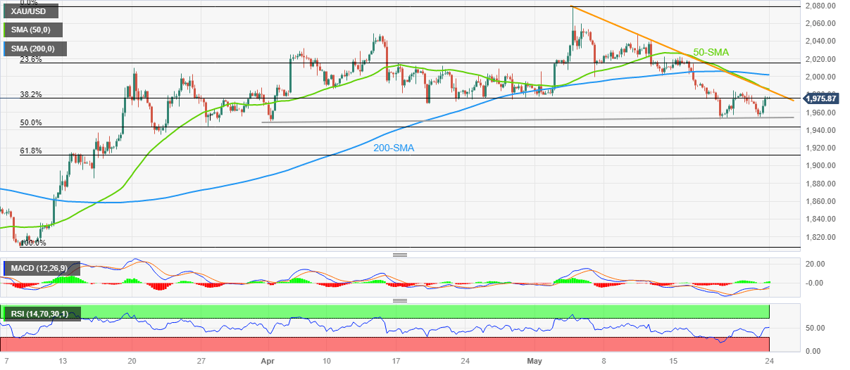 Gold price grinds higher after bouncing off an upward-sloping support line from early April, close to $1,954 by the press time. The XAU/USD rebound also takes clues from the bullish signals from the Moving Average Convergence and Divergence (MACD) indicators, as well as justifies the steady Relative Strength Index (RSI) line, placed at 14, surrounding 50.0 level.