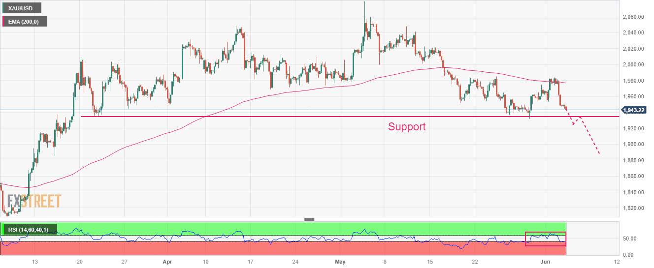 Gold price witnessed an intense sell-off after a mean-reversion move to near the 200-period Exponential Moving Average (EMA) at $1,977.32 on a four-hour scale. The precious metal is declining toward the key support plotted from March 22 low at $1,934.34.
