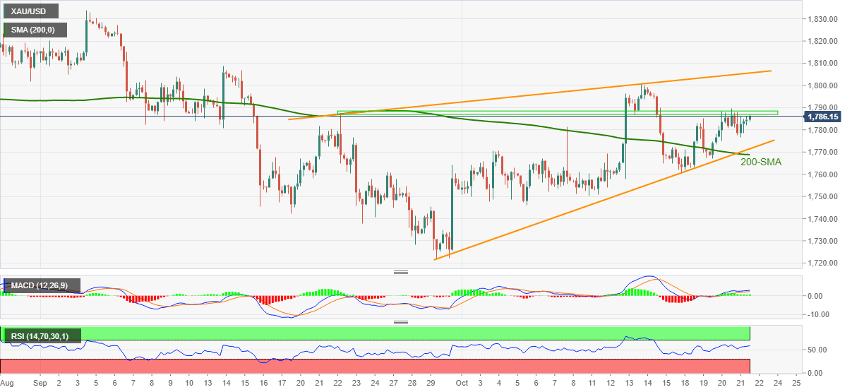 Gold buyers battle inside a monthly rising wedge bearish chart pattern amid mixed signals from the MACD histogram and RSI line. Though, the 200-SMA and support line of the stated chart formation offers a tough nut to crack for the sellers around $1,769.