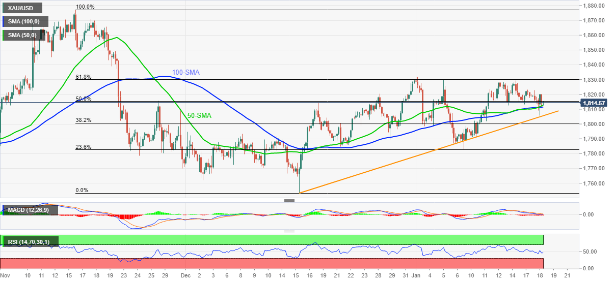 Gold (XAU/USD) prices keep the bounce off weekly low at around $1,815, up 0.05% intraday during Wednesday’s Asian session.