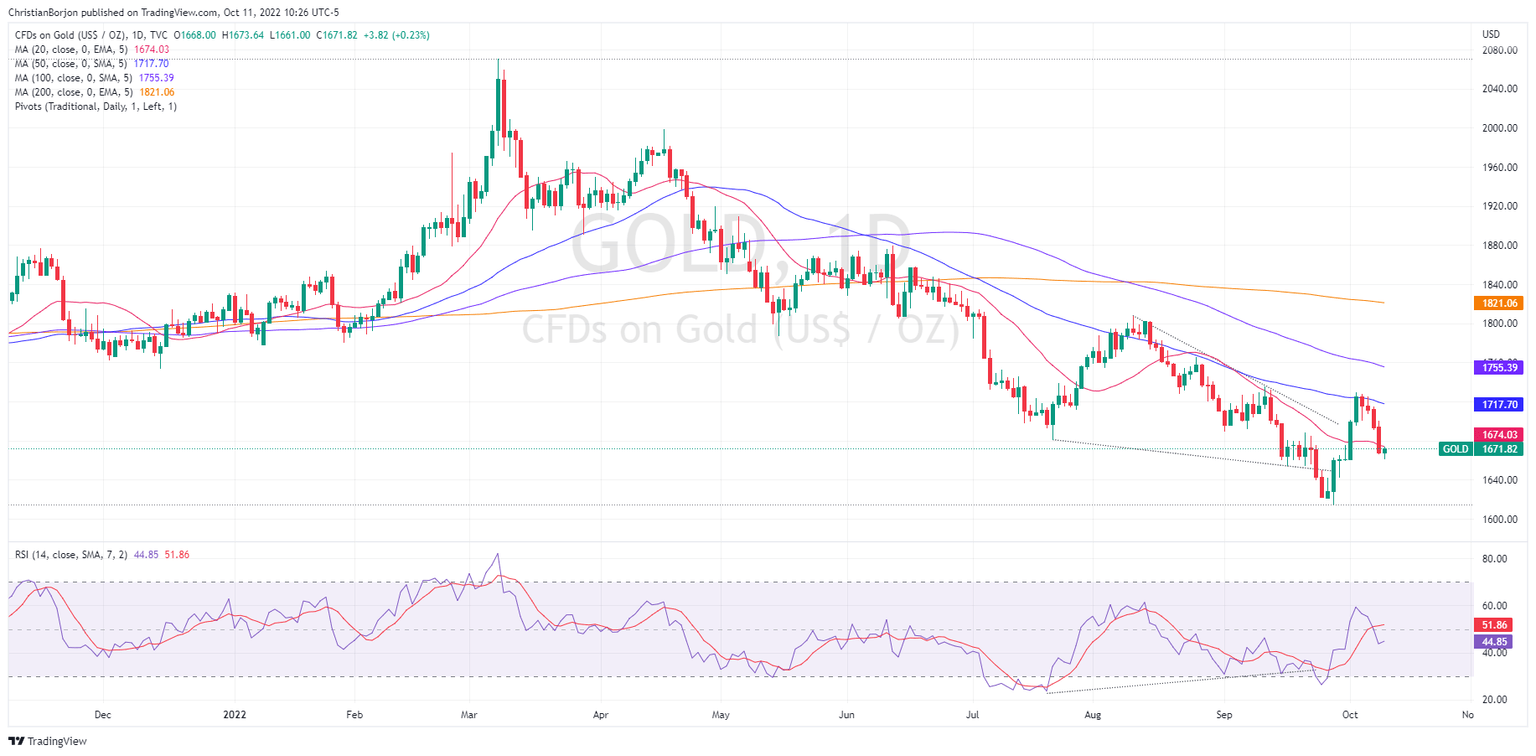 Gold price is slightly up during the North American session, due to high US T-bond yields, alongside a strong US dollar, ahead of crucial US inflation figures to be released on Thursday, which could shed some light regarding the need for further Fed aggressive hikes. Hence, XAU/USD is trading at $1671, a troy ounce, registering minimal gains at the time of writing.