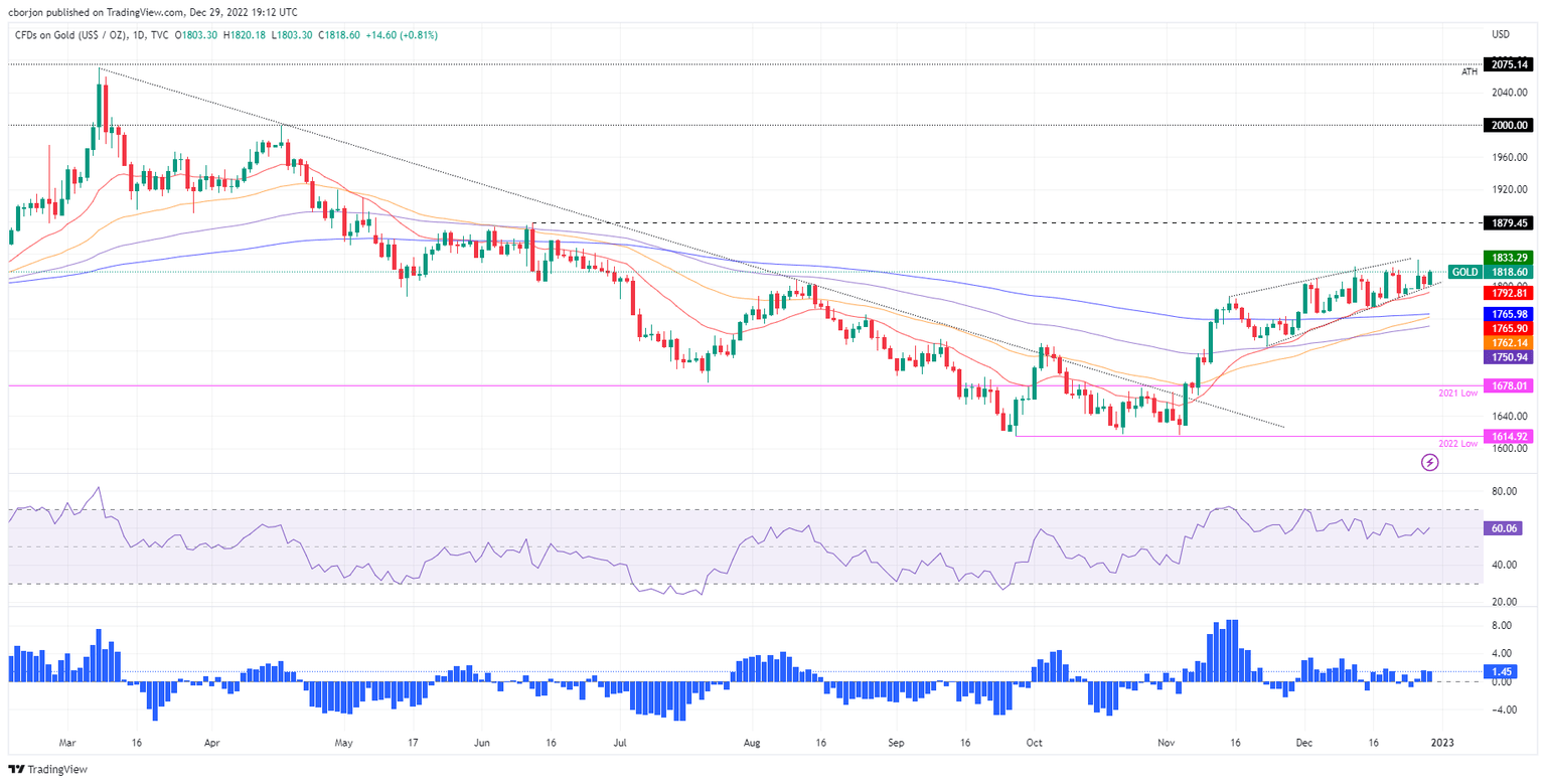 Gold Price advances after hitting a daily low of $1,803.30, gaining 0.83% during the North American session bolstered by falling US bond yields, which weakened the US Dollar (USD). Meanwhile, investors’ sentiment improved even though China relaxing Covid-19 policy keeps the health system pressured. At the time of writing, the XAU/USD is trading at $1,817.27, up by 0.74%.