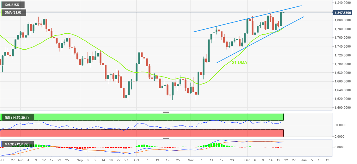 On the contrary, a convergence of the 21-DMA and the stated wedge’s lower line offers a tough nut to crack for the Gold bears, around $1,780. That said, the $1,800 round figure could restrict the short-term downside of the Gold price.