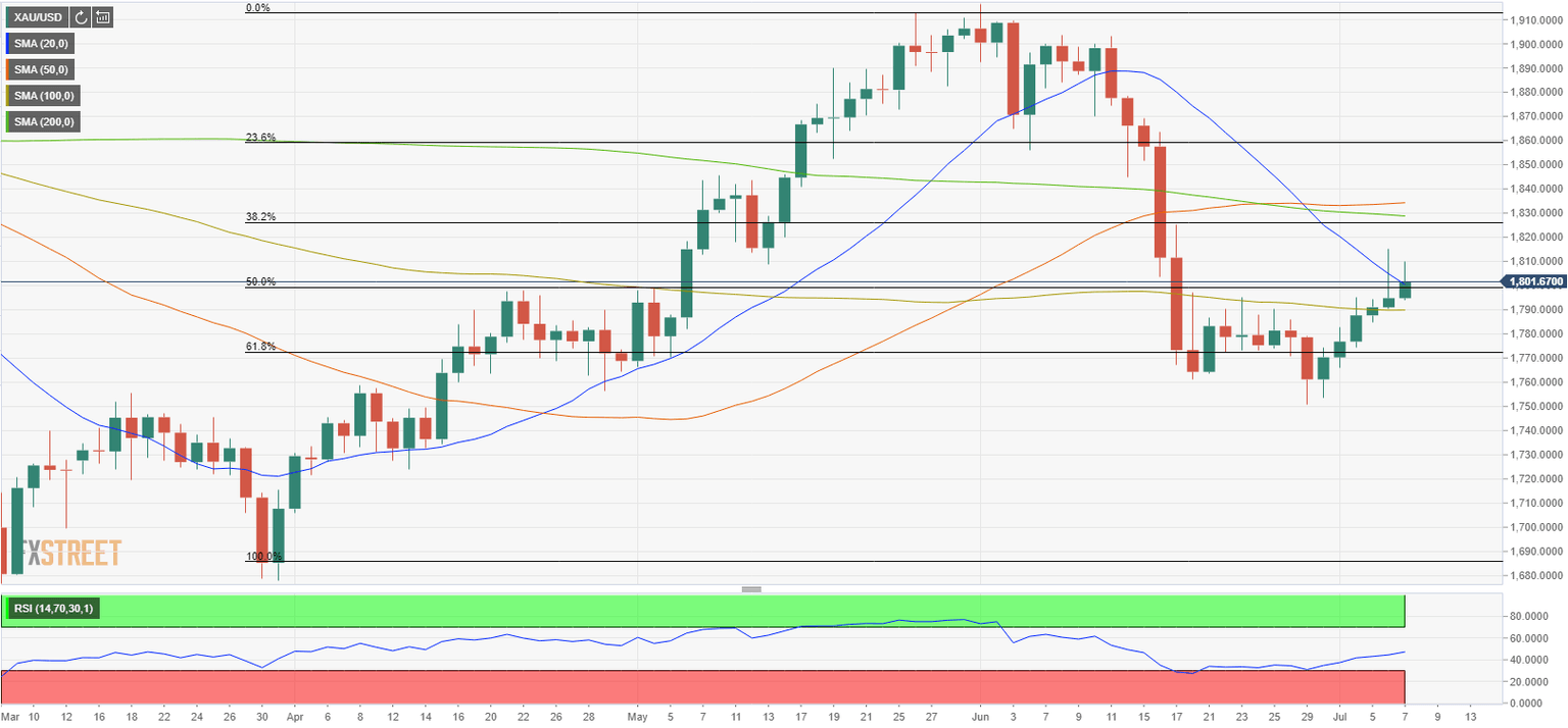 Update, July 7: The XAU/USD pair showed little to no reaction to the FOMC's June 15-16 meeting minutes and remains on track to post daily gains for the sixth straight trading day on Wednesday. As of writing, gold was up 0.5% on the day at $1,806.