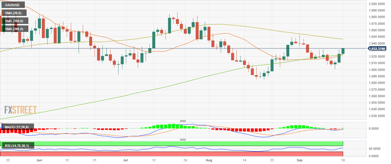 On Monday, the Gold spot price XAU/USD is holding above the 20 and 200-day Simple Moving Average (SMA) convergence at $1,922-1,923, rising to $1,930. Markets remain cautious ahead of the Federal Reserve (Fed), Bank of England (BoE) and Bank of Japan (BoJ), where the British bank is the only one expected to hike rates.