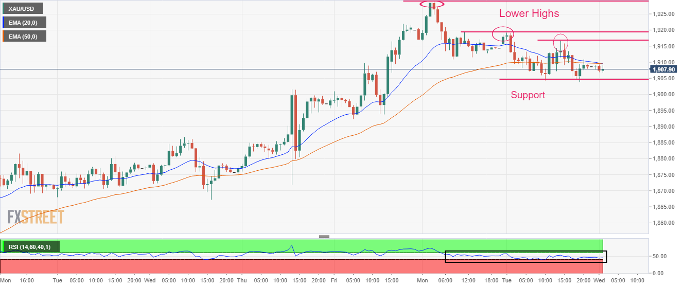 Gold price demonstrates the formation of Lower Highs on an hourly scale, communicating signs of bearish reversal. The precious metal might display sheer weakness after breaking the horizontal support plotted from Tuesday’s low marginally below $1,905.00.