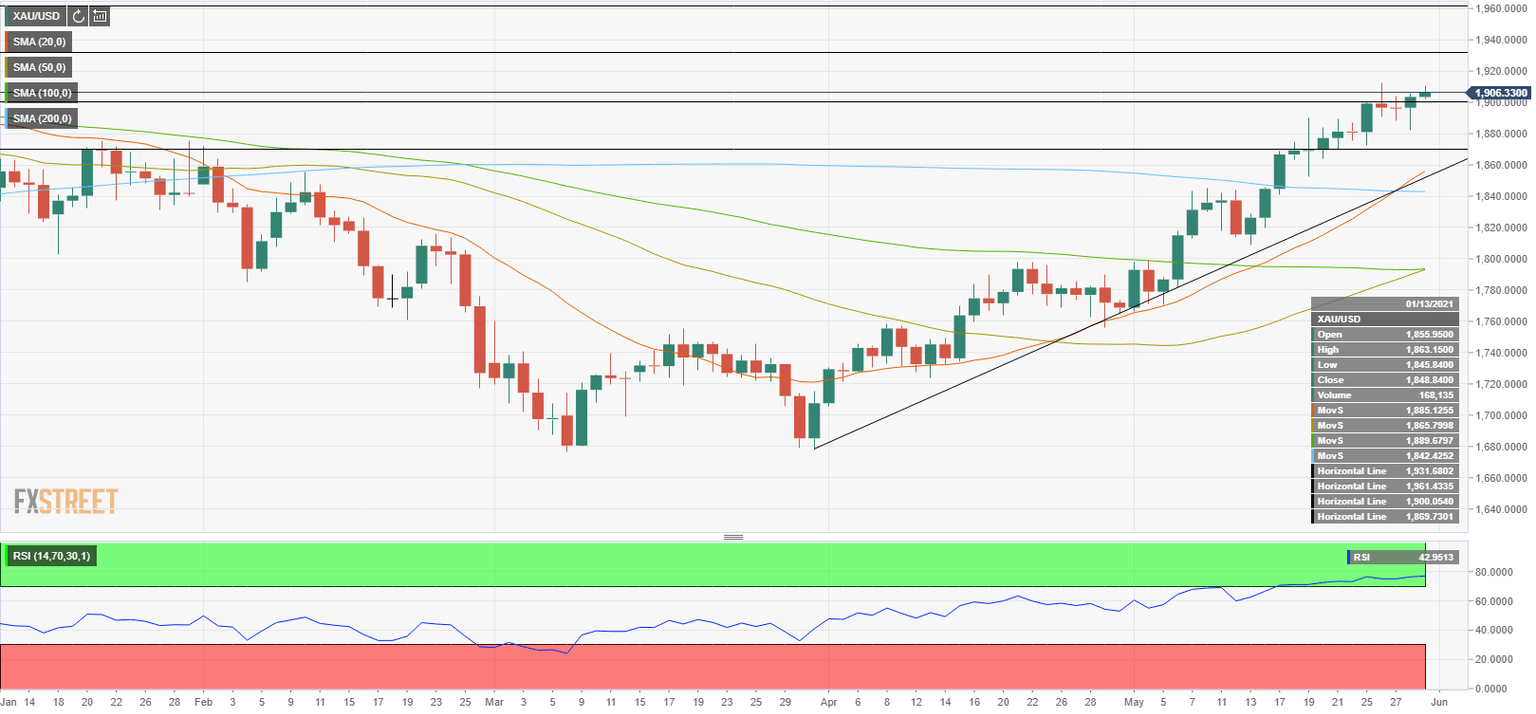The XAU/USD pair closed the fourth straight week in the positive territory on Friday and went into a consolidation phase on Monday. Although gold climbed to a daily high of $1,910 during the European trading hours, it struggled to gather momentum and remains on track to close the day with modest gains above $1,900. Financial markets in the US will remain closed due to the Memorial Day holiday in the US and the pair is not expected to break out of its daily trading range.