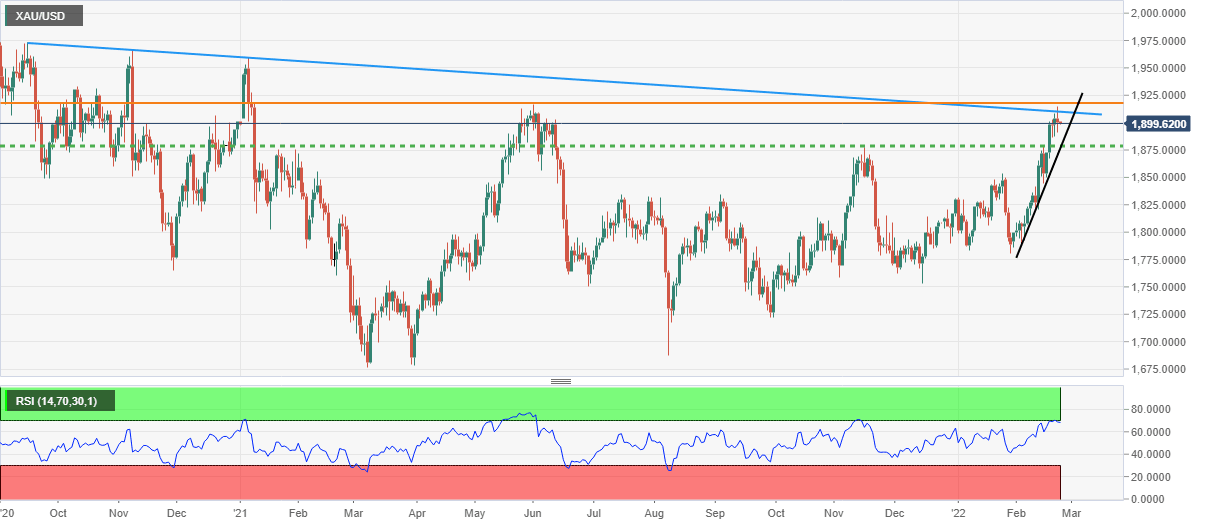 Update: Gold price is pivoting around $1,900, lacking a clear directional bias this Wednesday, as investors rethink the geopolitical risks surrounding the Ukraine standoff, especially after the Western sanctions imposed on Russia a day before. Meanwhile, the US Treasury yields hold the recent advance, offsetting the safe-haven demand for the metal, keeping the price more or less in a $5 narrow range. A relatively data-light week also offers little for gold traders while geopolitics stays in the spotlight. Meanwhile, aggressive Fed rate hike expectations are back on the table amid resurfacing worries over inflation, as the Russia-Ukraine crisis nudge energy prices higher. Looking ahead, the geopolitical updates surrounding the Russia-Ukraine turmoil will continue impacting the bright metal.