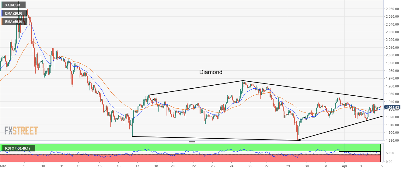 On an hourly scale, XAU/USD is oscillating in a diamond pattern that signals a bullish reversal after a steep fall. The formation indicates inventory adjustment in which the inventory is shifted from retail participants to institutional investors. The 20- and 50-period Exponential Moving Averages (EMAs) near $1,930 are overlapping to each other, which signal a consolidation ahead. Meanwhile, the Relative Strength Index (RSI) (14) is oscillating in a 40.00-60.00 range, which indicates a lackluster performance.