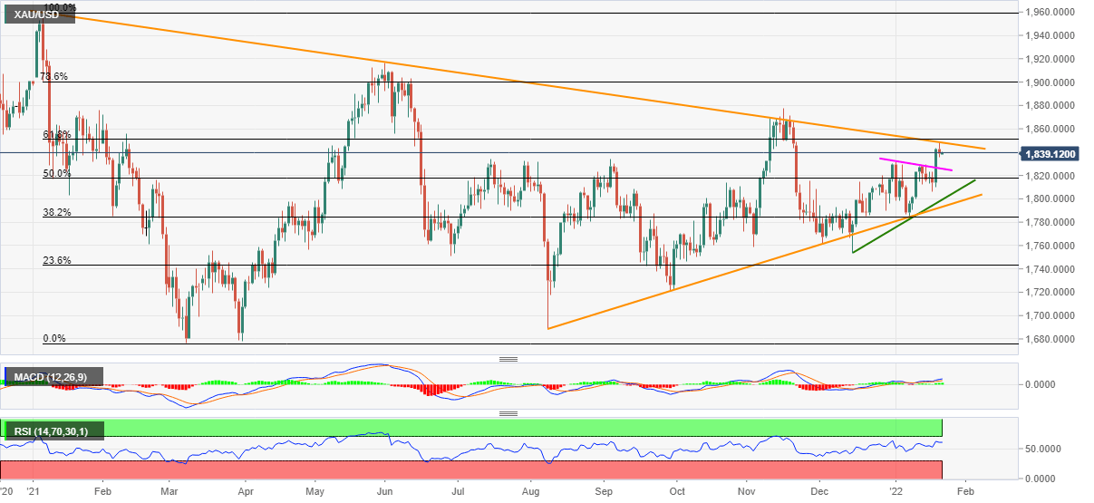 Gold (XAU/USD) extends late Thursday’s pullback from a two-month high, refreshes intraday low around $1,838 during Friday’s Asian session. In doing so, the yellow metal bears the burden of the risk-off mood even as the US Treasury yields stay on the back foot.