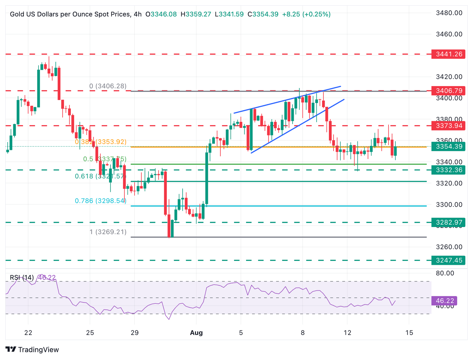 Gold (XAU/USD) reversal from last week's highs right above $3,400 has been contained at the $3,335-$3,345 area, where the pair has found support at August 4 and 5 lows, and the 50% Fibonacci retracement of the early August rally.