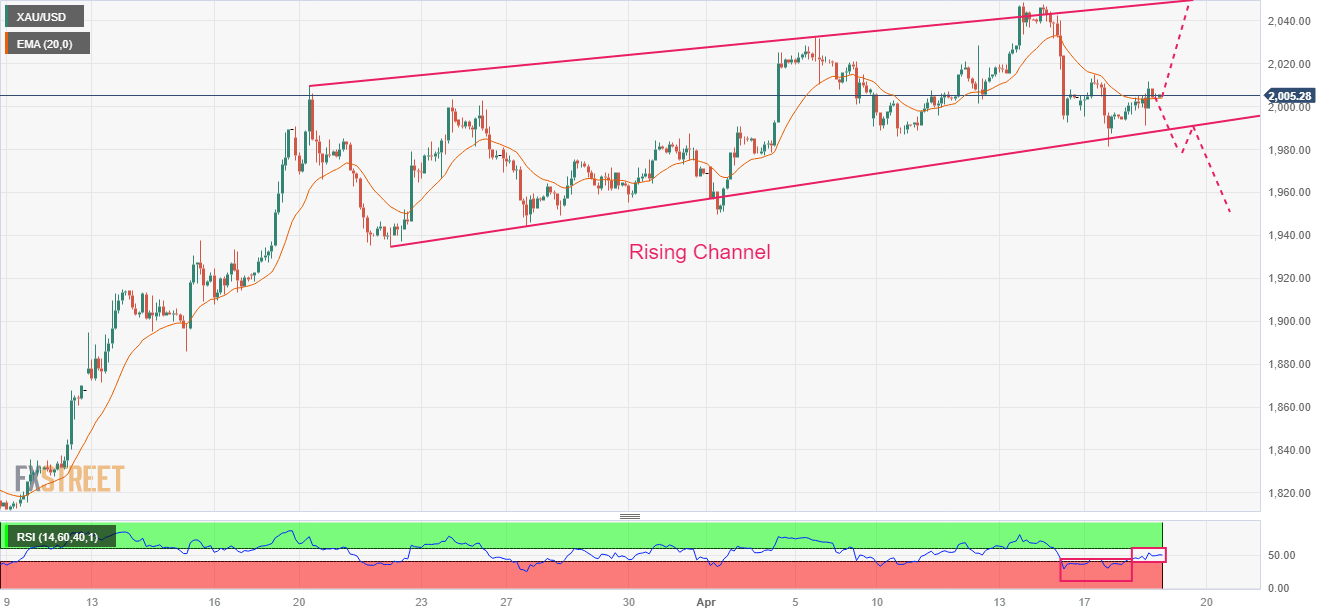 Gold price has defended a breakdown of the Rising Channel chart pattern for now formed on a two-hour scale. The precious metal is making efforts for shifting comfortably above the 20-period Exponential Moving Average (EMA), which is hovering at $2,004.30.