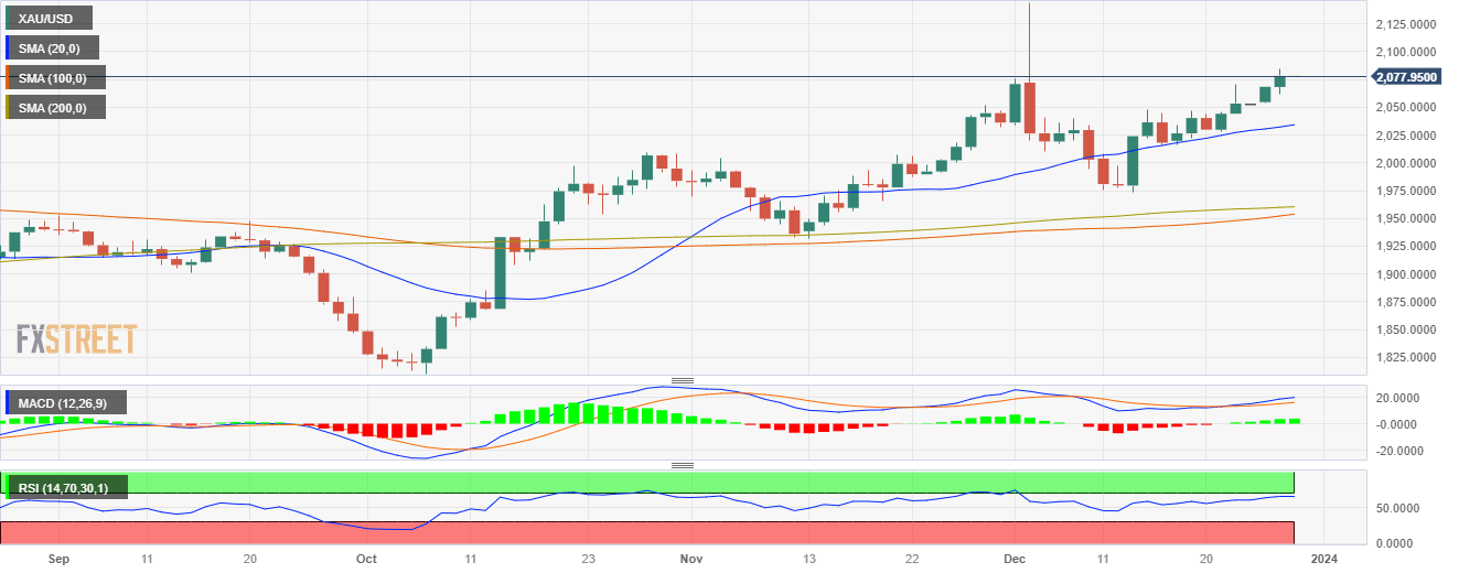 - The XAU/USD trades closely to the $2,070 level, registering strong gains.