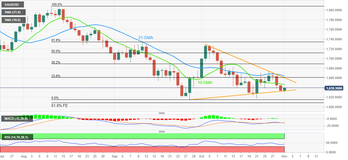 Gold price (XAU/USD) grinds higher around $1,640 while snapping a two-day downtrend heading into Tuesday’s European session. In doing so, the yellow metal cheers the US dollar pullback, as well as sluggish Treasury yields, as traders brace for today’s US PMIs for October and Wednesday’s all-important Federal Open Market Committee (FOMC) meeting.