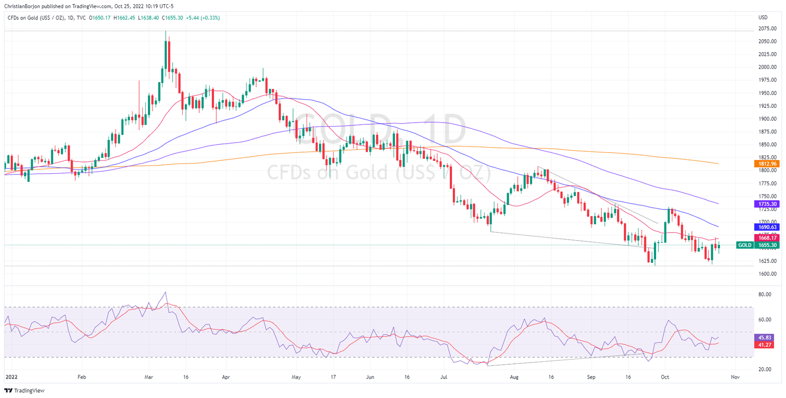 XAU/USD remains downward biased, as shown by the daily chart, with price action remaining below the 20, 50, 100, and 200-day Exponential Moving Averages (EMAs). Gold unsuccessfully tested the 20-day EMA in the last seven days at around $1668, with prices falling afterward. So a break above the latter is needed to clear the way towards the 50-day EMA at $1690.63. Otherwise, a retest of the MTD low at $1617.30, ahead of $1600, is on the cards.