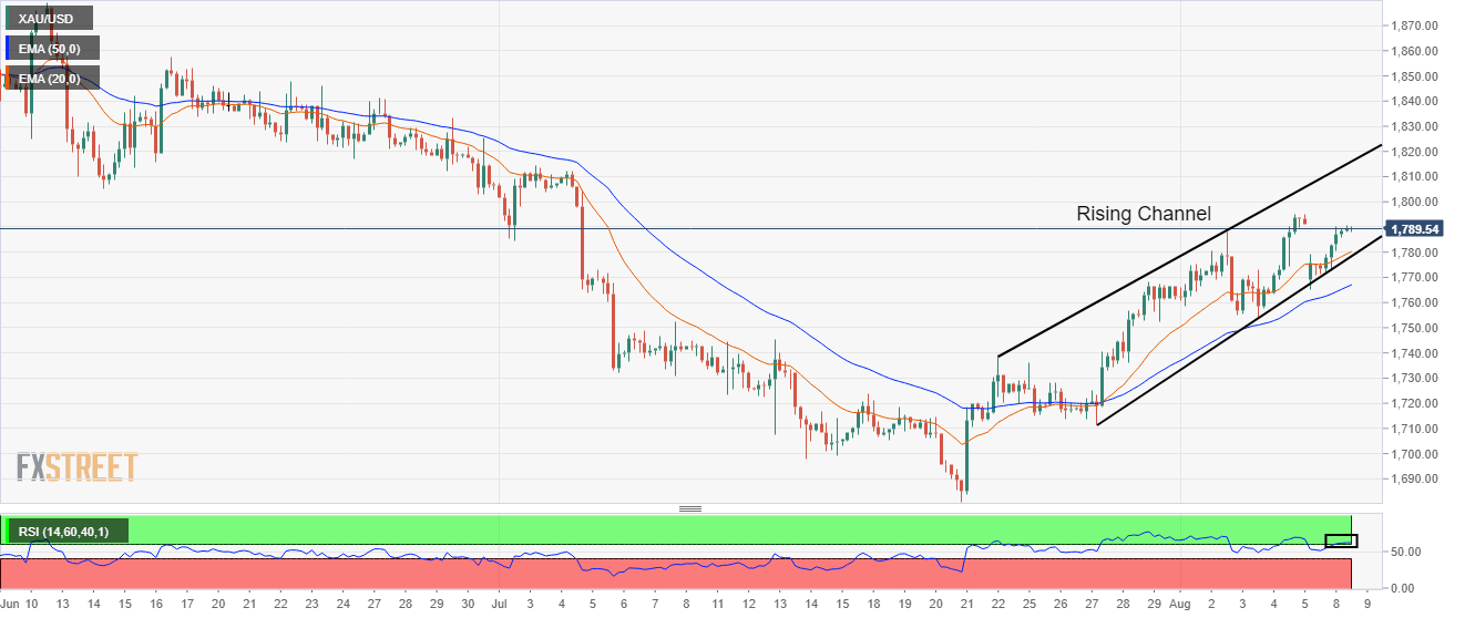 The gold bulls have defended the 20-period Exponential Moving Average (EMA) at $1,775.50. While, the 50-EMA at $1,767.11 has remained untouched despite a corrective move, which indicates that the short-term trend is extremely bullish.