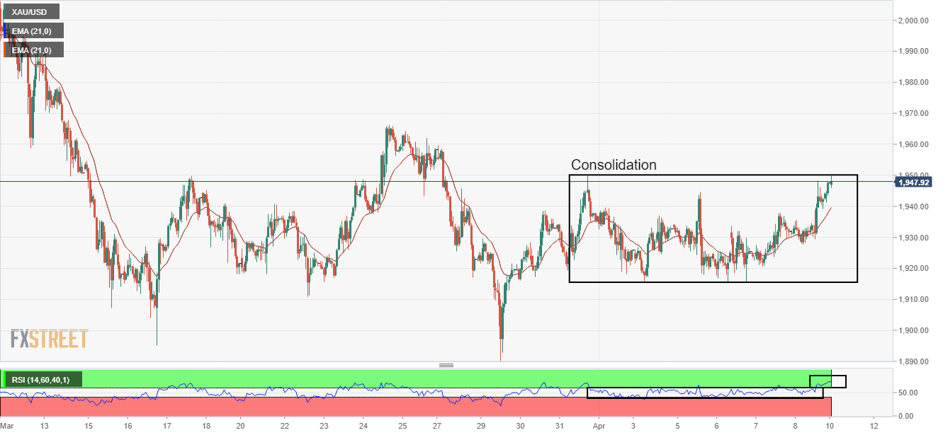 On an hourly scale, XAU/USD is on the verge of exploding the consolidation, which is placed in a narrow range of $1,915.50-1,950.00. The 20- and 200-period Exponential Moving Averages (EMAs) at $1,940.00 and $1,931.45 respectively are scaling higher, which adds to the upside filters. The Relative Strength Index (RSI) (14) has shifted into a bullish range of 60.00-80.00, which indicates more upside ahead.