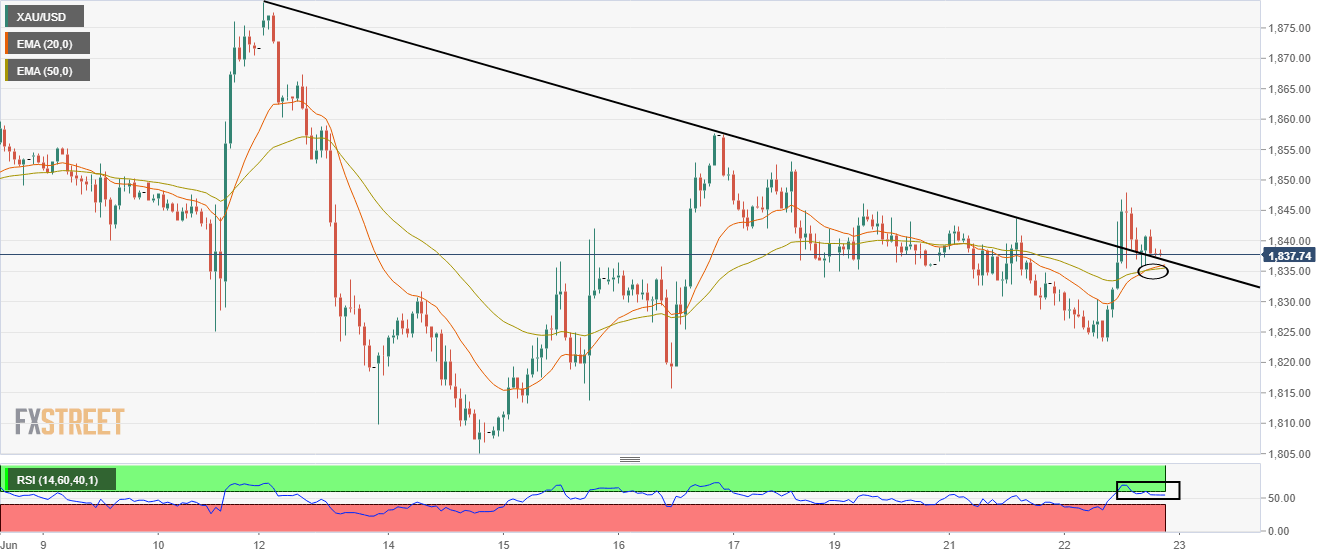 On an hourly scale, the gold prices have overstepped the downward sloping trendline placed from June 12 high at $1,879.26, adjoining June 16 high at $1,857.40. The precious metal is balancing and is expected to extend recovery after sustaining above the critical hurdle of $1,840.00. A bull cross, represented by 20- and 50-period Exponential Moving Averages (EMAs) at $1,835.20 add to the upside filters. The Relative Strength Index (RSI) (14) is expected to extend gains after violating 60.00 decisively.