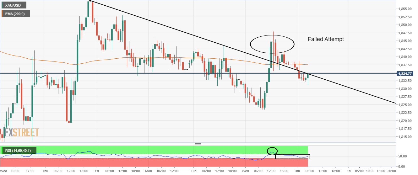 On an hourly scale, the gold prices have displayed a failed attempt of overstepping the downward sloping trendline placed from the June 16 high at $1,857.58 but is attempting to surpass again. The greenback bulls have defended the 200-period Exponential Moving Average (EMA) at $1,837.50. Meanwhile, the Relative Strength Index (RSI) (14) has returned into the 40.00-60.00 range after failing to sustain above 60.00.