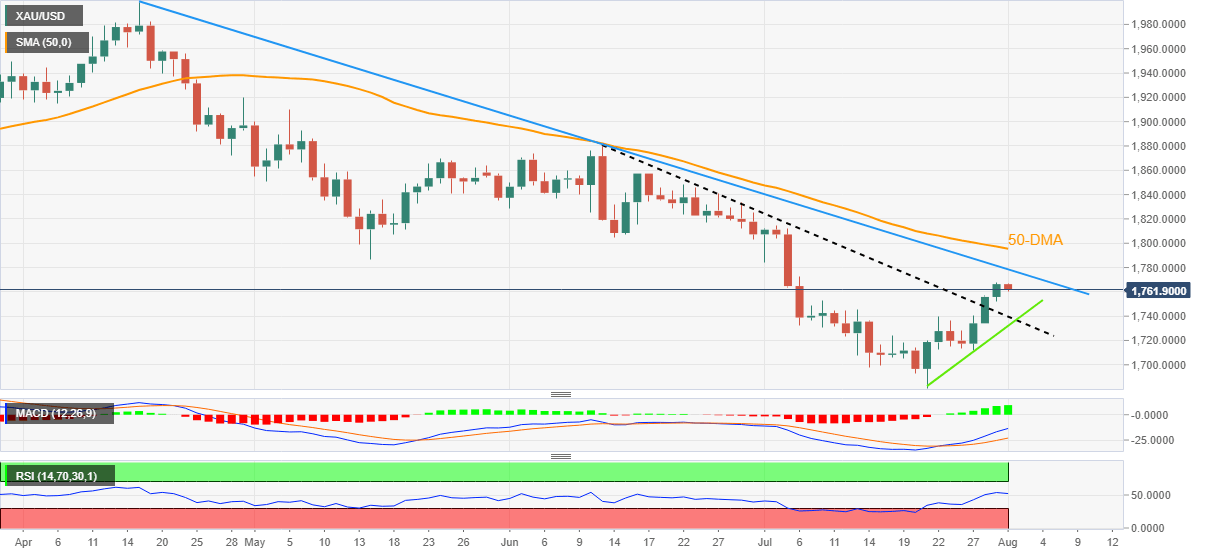 Alternatively, the gold price remains on the way to a downward sloping resistance line from April 18, close to $1,780 by the press time. However, the 50-DMA level surrounding $1,795 could challenge the metal buyers afterward.