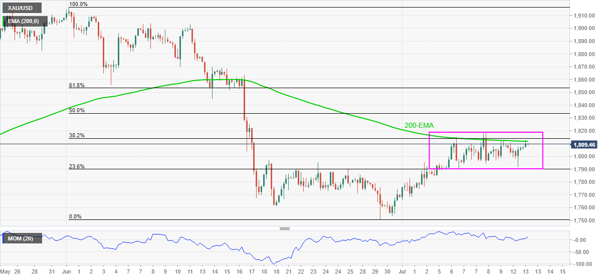 Gold remains capped inside a weekly rectangle amid strong Momentum. However, the bulls seek a clear upside break of the $1,811-15 resistance area, comprising 200-EMA and 38.2% Fibonacci retracement of June’s downturn, to keep the reins.