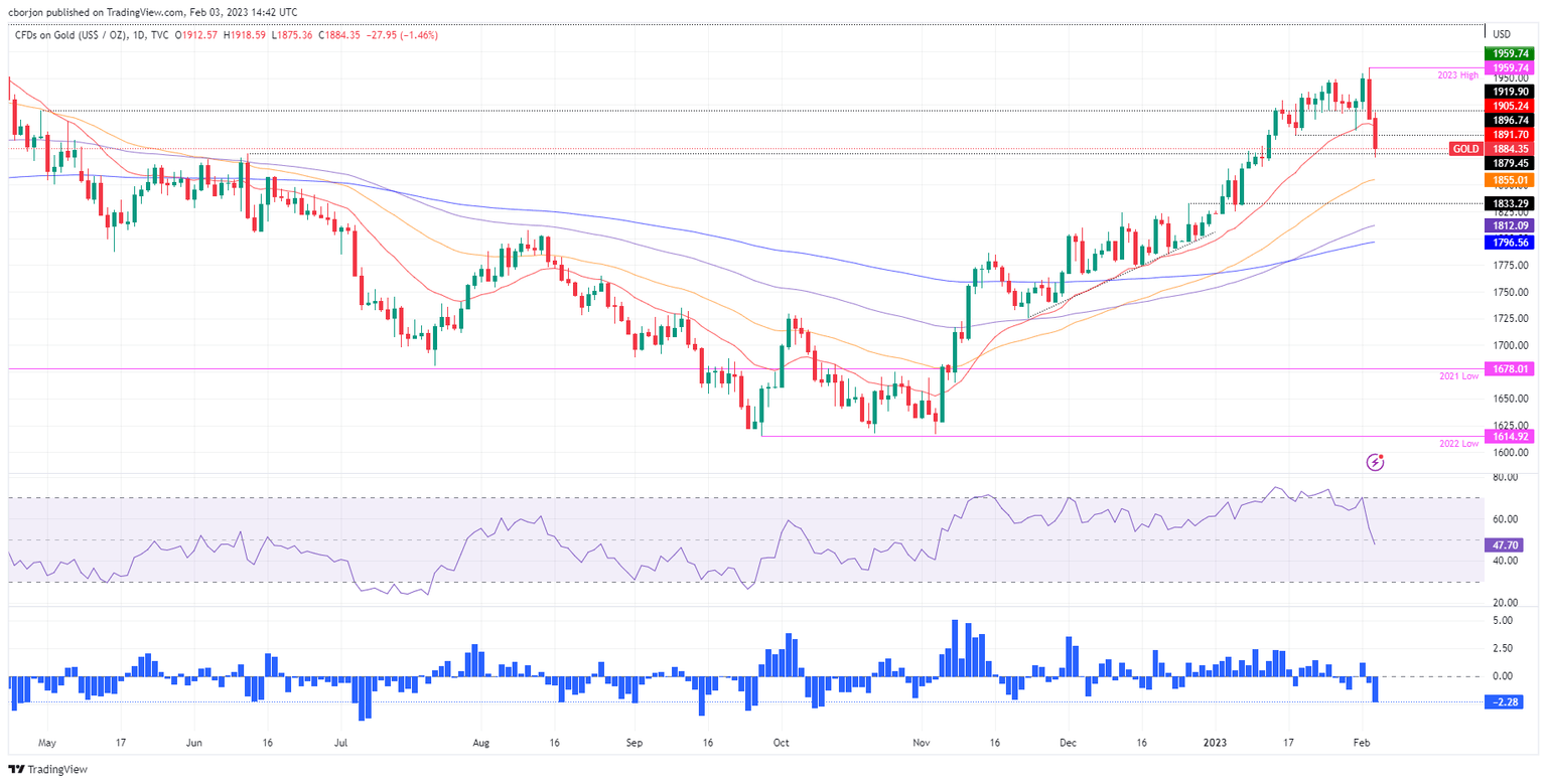 US equity futures remain negative as Wall Street is set to open in the red. The greenback was lifted by a surprisingly upbeat US Nonfarm Payrolls report for January added 517 jobs in the last statement, raising the buck from its ashes, as the US Dollar Index advanced 0.58% and reached a new two-week high at 102.63. Consequently, the XAU/USD extended its losses below the January 18 daily low of $1896.74 and the 20-day Exponential Moving Average (EMA) at $1891.70.