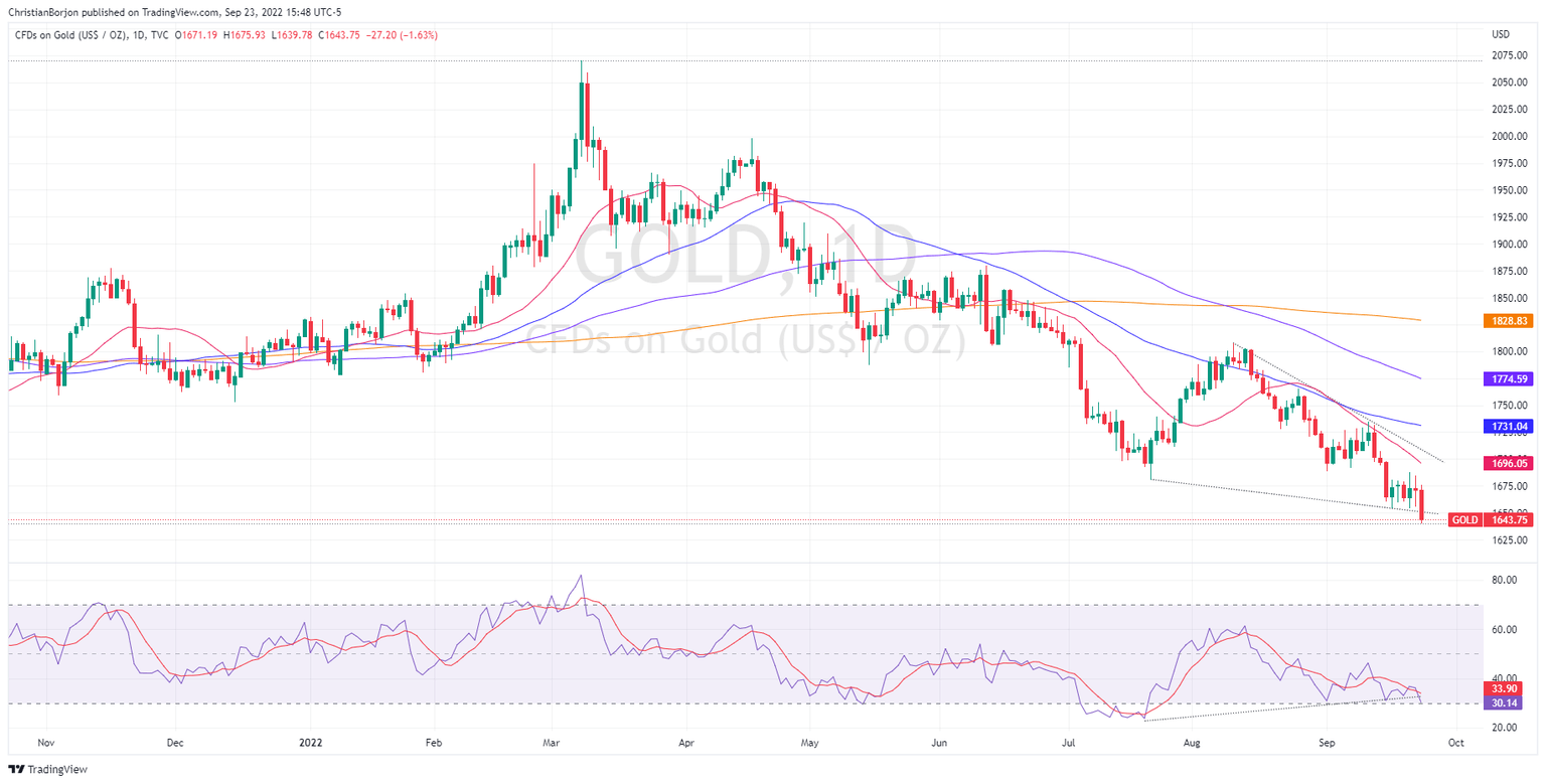 Gold price slides to fresh two-and-half-year lows dampened by a risk-off mood and flows towards the US dollar, which rose to new two-decade highs. Overall, US dollar strength and higher US Treasury bond yields are two reasons for the fall in the precious metals complex, mainly the yellow metal. At the time of writing, XAU/USD is trading at $1643.50 a troy ounce.