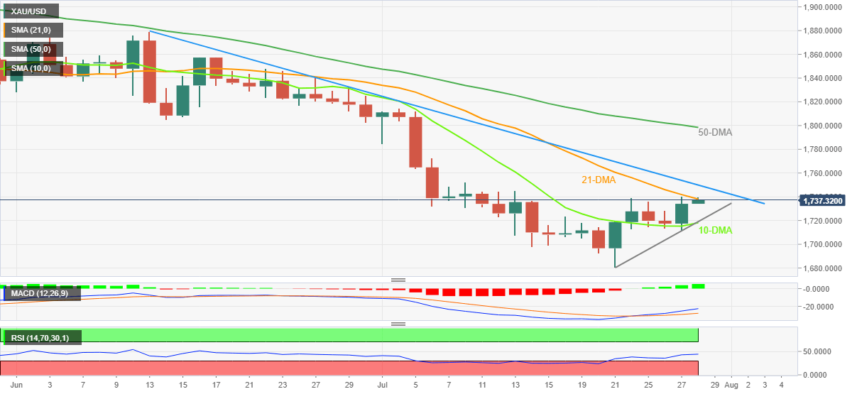 Gold price remains firmer around a two-week top as bulls jostle with the 21-DMA resistance near $1,740. Keeping the buyers hopeful are the MACD signals and the metal’s sustained trading beyond the 10-DMA, as well as the weekly support line.