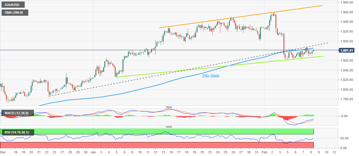 Gold price holds onto the week-start recovery from a five-week-old ascending support line, around $1,865 by the press time. Adding strength to the upside bias are the bullish MACD signals and firmer RSI (14).