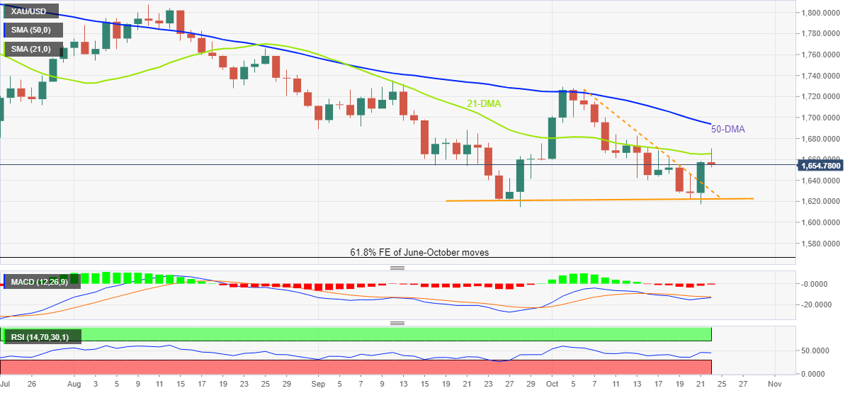Gold price retreats from the 21-DMA hurdle amid bearish MACD signals and sluggish RSI, which suggests the metal’s further declines towards the resistance-turned-support line from October 06, around $1,630 by the press time.
