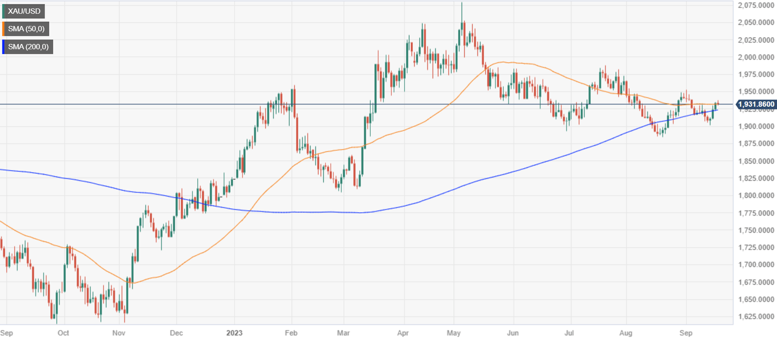 Gold price retreats after hitting a two-week high at $1937.35 as investors remain on the sidelines ahead of the US Federal Reserve monetary policy decision. US Treasury bond yields are climbing ahead of the Fed’s decision, a headwind for the yellow metal, which was shy of clashing with the 100-DMA. At the time of writing, the XAU/USD is trading at $1931.77, down 0.06%.